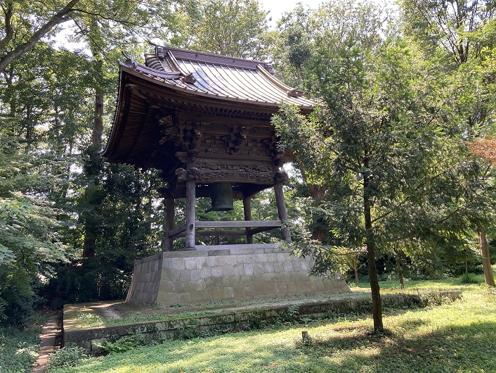 浄真寺の敷地は、もともとは世田谷吉良氏系の奥沢城の城跡でした。奥沢城は室町時代の16世紀中頃に吉良氏により出城として築かれ、豊臣秀吉による天正18年(1590年)の小田原征伐後に廃城となりました。今でも境内を囲むように土塁が残っています。1793年に建立された二体の仁王像が睨みをきかす山門を潜ると、左手に1708年に建立された鐘楼が鎮座しています。更に進みますと、本堂に向かって同形の阿弥陀堂3棟(三仏堂)が一列に並んで建っており、珍しい伽藍配置となっています。九品仏の名称は、この阿弥陀堂3棟に各3体安置されている計9体の阿弥陀如来像に由来しています。お寺の見物を切り上げ、城壁を思わせる塀に沿って裏手にあるねこじゃらし公園に向かいます。