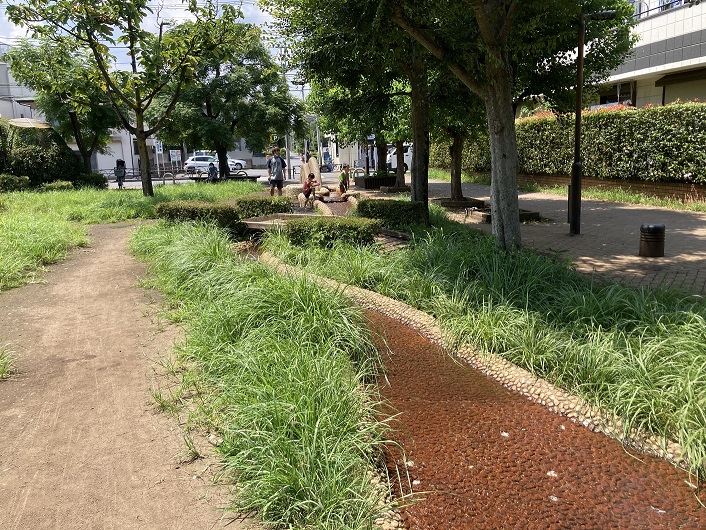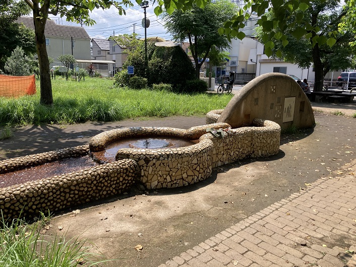 公園の入口近くに石造りのモニュメントが設置されています。一見するとガウディの作品のようにも見えますが、子供の水遊び場のようです。中央の窪地から水が流れ出しています。既に九品仏池は埋立てられていますので、この水は湧き水というより水道水と考えた方が良いでしょう。モニュメントから流れ出た水は、その先で小さな小川となって公園の外に流れ出ています。僅かな水量ですが、子供達の水遊びにはちょうど良いでしょう。ここで、九品仏川について以下にまとめてみます。