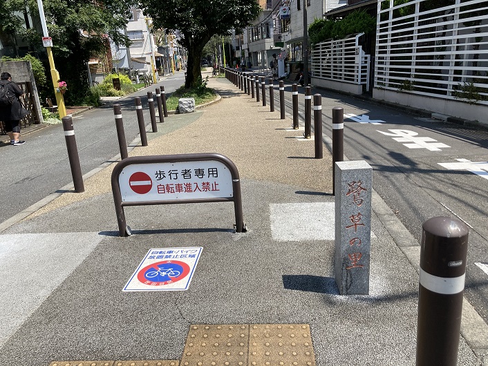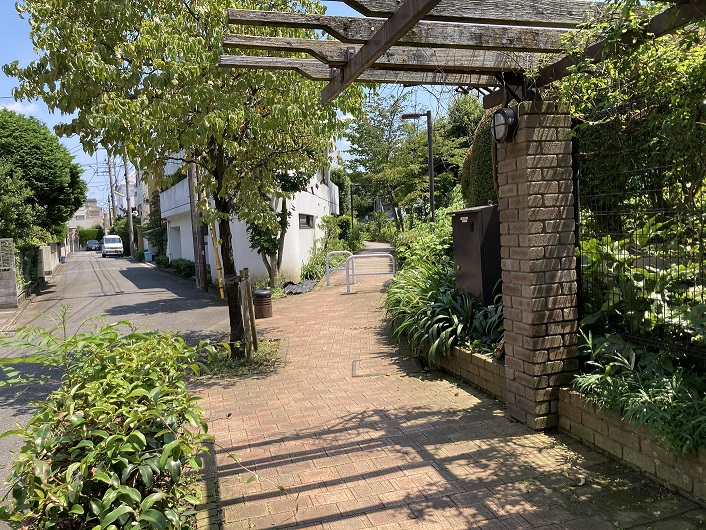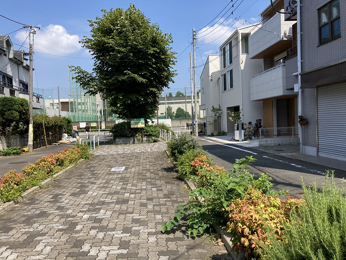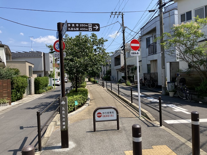 遊歩道は一般道とは分かれて住宅地の中に延びています。少し先で住宅地を抜けますと、一般道の中央に九品仏川緑道が現れます。街の風景によくマッチしたお洒落な遊歩道です。