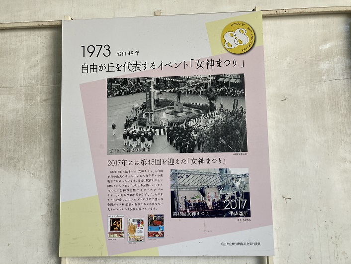 回り道をして大井町線の反対側の緑道に戻ってきました。東横線のガード下を通りますと、壁に自由が丘の歴史を記したポスターが何枚か貼ってありました。女神祭り、懐かしいですね。私が住んでいた頃は、春のマリ・クレール祭りと秋の女神祭りが自由が丘の一大イベントでした。街中の路地に屋台や出し物が出店され、ワイン片手にベロベロになるまで歩きまわったものです。最近はご無沙汰していますが、今年は行ってみようかな?と思ったら、2020年は中止が決まったそうです。残念!自由が駅南口のマニ・クレール通りからひとつ奥に九品仏川緑道が延びています。ベンチが設置されていて、お祭りの時は屋台で調達したおつまみを肴にワインのグラスを傾ける人達で満席になります。
