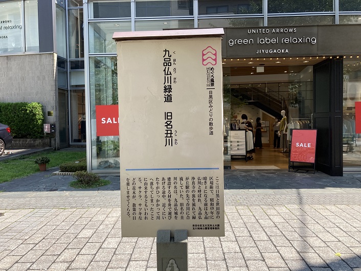 九品仏川は、世田谷区と目黒区を流れる二級河川です(でした)。総延長は2.61kmで、呑川水系の支流であると共に 、玉川上水の品川分水のひとつになっています。現在は下水道幹線となっていて、世田谷区奥沢の九品仏浄真寺付近を水源として、東横線自由が丘駅南口付近を通っています。この付近はマリクレール通りと称される商店街になっていて、春には桜並木に花見客が賑わいます。その後、住宅地を進み、大井町線緑が丘駅と大岡山駅の中間付近(東京工業大学付近)で呑川に合流します。現在、九品仏川は全て暗渠化されていて、その上には緑道が設置されています。