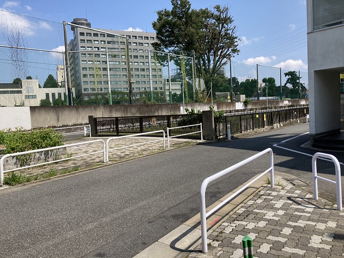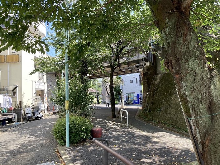 自由が丘駅南口の商店街を抜けた先にも緑道が続いています。再び大井町線と交差する手前に自由が丘スイーツフォレストへの階段が延びています。