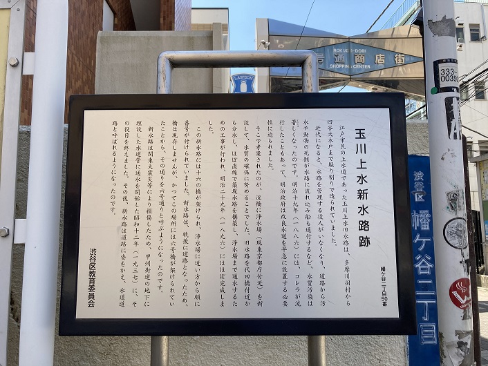 - 昨日の続きで玉川上水を歩こうと中断地点の二字橋に向っていましたら、途中の六号通り商店街の入口に玉川上水新水路跡の案内板を見つけました。六号道路(水道道路)はよく歩いているのですが、玉川上水と関係があるとは思ってもみませんでした。