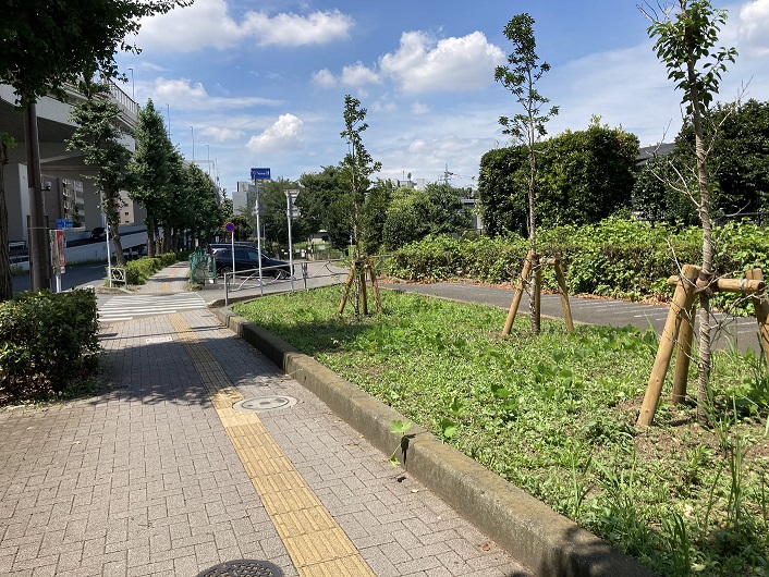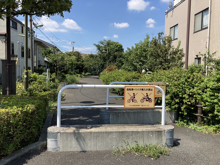 緑道は、井ノ頭通りにある大山交差点の手前で中野通り(正式には中野通りは笹塚交差点で終わっていますが)を横断します。ここから先の区間は渋谷区立玉川上水旧水路緑道(大山町地区)となります。緑道の両側には手入れされた植栽が生い茂り、路面もきれいに舗装されて歩きやすいですね。