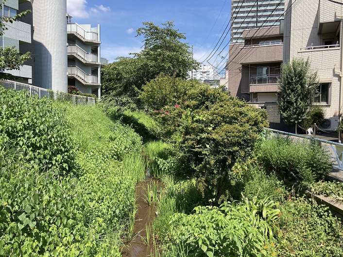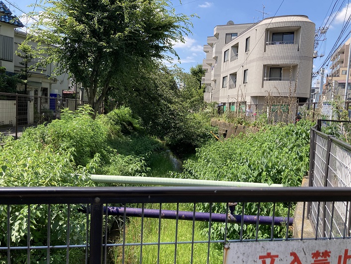 緑道は笹塚駅に向って北西方向に延びています。笹塚駅の手前で玉川上水は四谷大木戸から続いてきた(実際は初台辺りからだと思うのですが)暗渠区間から開放され、川面が顔を出します。水量は殆どなく、繁殖した木々・雑草が両岸から迫っています。