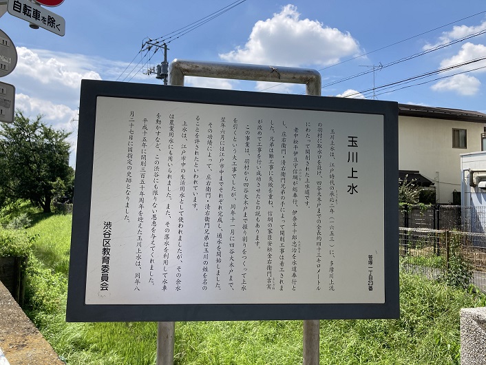玉川上水は、江戸時代の承応(じょうおう)二年(一六五三年)に、多摩川上流の羽村に取水口を設け、四谷大木戸までの全長約四十三キロメートルにわたって開削された上水道です。老中松平伊豆守(まつだいらいずのかみ))信綱(のぶつな)が総奉行、伊奈半十郎忠治(ただはる)を水道奉行とし、庄右衛門(しょうえもん)・清右衛門(せいえもん)兄弟の手によって開削工事は着工されました。兄弟は難工事に失敗を重ね、信綱の家臣安松金右衛門(やすまつきんえもん)吉実(よしざね)が改めて工事を行い成功させたとの説もあります。この事業は、羽村から四谷大木戸まで掘り割りをつくって上水を引くという大工事でしたが、同年十一月に四谷大木戸まで、翌年六月には江戸市中までそれぞれ完成し、通水を開始しました。その功績によって、庄右衛門・清右衛門兄弟は玉川の姓を名のることを許されたといわれています。上水は、江戸市中の生活用水として使われましたが、その余水は農業用水にも用いられました。また、その落水を使用して水車を動かすなど、この渋谷にも限りない恩恵を与えてくれました。平成十五年に開削三百五十年周年を迎えた玉川上水は、同年八月二十七日に国指定の史跡となりました。