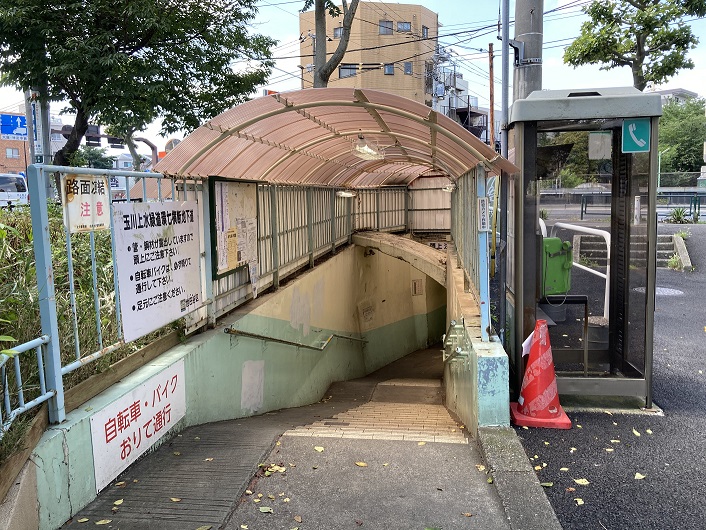 緑道は環七で一旦中断しますが、反対側で再び緑道が始まります。離れた信号のある横断歩道を渡ろうとしたら、緑道の脇に環七を横断する歩行者専用の地下道を見つけました。これを使うと簡単に環七を渡ることができます。
