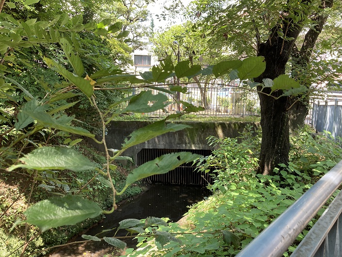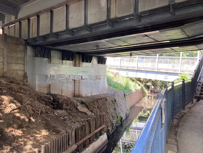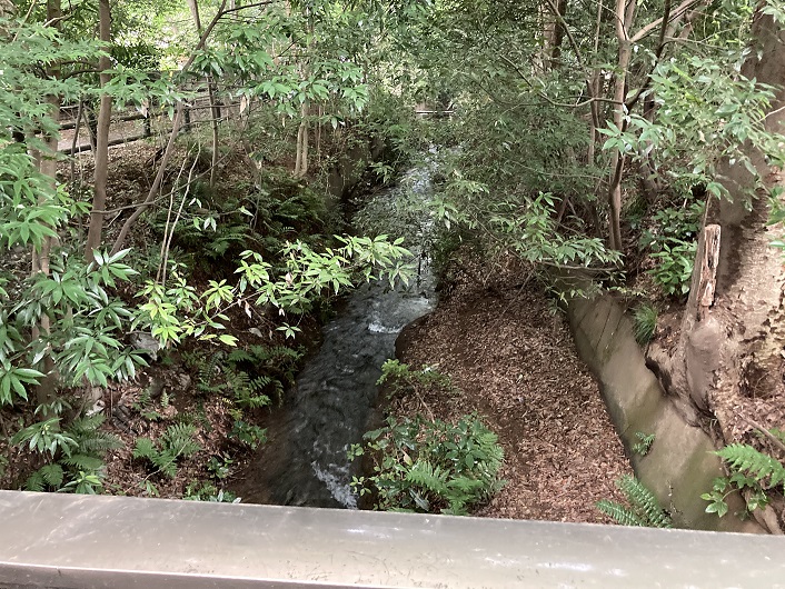 ゆずり橋を越えた先はまるで渓谷のような雰囲気になっています。京王線の線路の下を細い通路で潜るのですが、下を見ると玉川上水の水が流れているのが見えます。こんな地下通路があるとは知りませんでした。