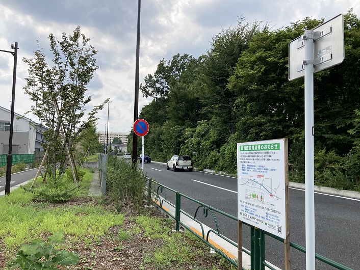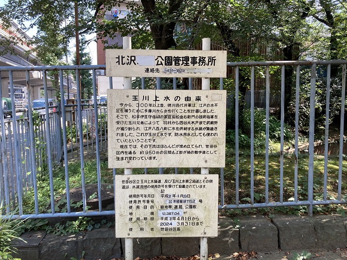 地下通路を抜けた先は甲州街道となります。玉川上水は甲州街道とぶつかった地点で左に向きを変え、甲州街道の歩道の下を流れます。甲州街道の脇に狭い空き地が有り、そこに公園管理事務所の案内板が立っていました。