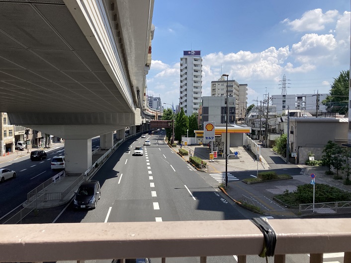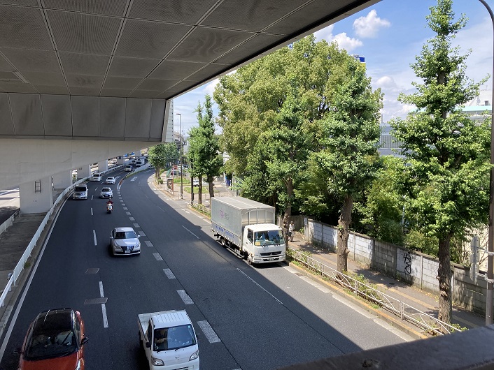 甲州街道に出ますと、玉川上水の痕跡が見えなくなります。以前から疑問に思っていたのですが、世田谷区内の玉川上水緑道と杉並区の玉川上水公園をつなぐルートはどうなっているのか?甲州街道に架けられた歩道橋に上がって前後を見て納得しました。甲州街道とぶつかった玉川上水は、歩道橋の手前まで歩道に沿って流れ、ちょうど歩道橋あたりで斜めに甲州街道を横断していたようです。甲州街道の反対側を見ますと、緑道らしき道が延びています。