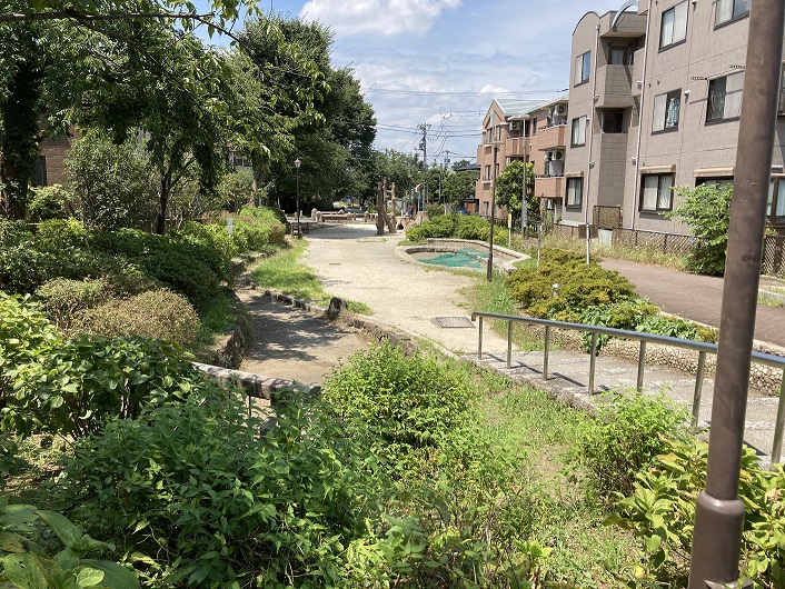 玉川上水は笹塚駅前からやや南方向に向きを変えます。川幅が少し広くなりますが、川全体が木々と雑草に覆われています。環七の手前で再び暗渠区間が始まり、上部は緑道と児童公園になっています。