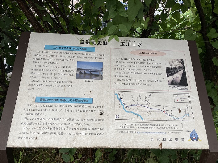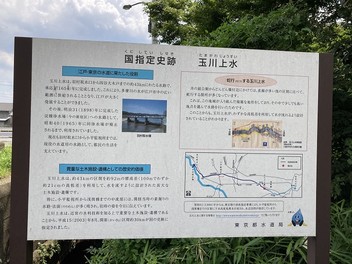 玉川上水は、約43kmの区間を約92mの標高差(100mでわずか約21cmの高低差)を利用して、水を流すように設計された長大な土木施設・遺構です。特に、小平監視所から浅間橋までの中流部には、開削当時の素掘りの水路・法面(のりめん)が多く残され、往時の姿を今日に伝えています。玉川上水は、近世の水利技術を知る上で重要な土木施設・遺構であることから、平成15年(2003年)8月、開渠(かいきょ)区間約30kmが国の史跡に指定されました。