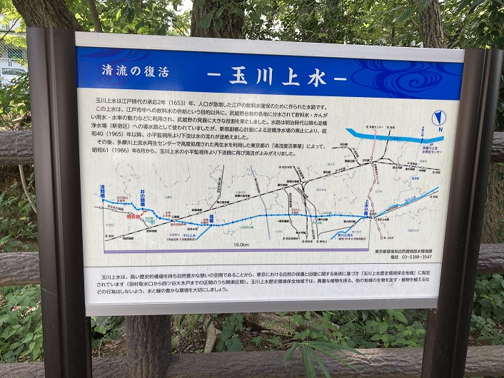 今から、300年以上昔、徳川四代将軍は、江戸の水不足を補うために多摩川から水を引くことを計画しました。そこで、松平伊豆守信綱の家臣安松金右衛門の技術指導を受けた玉川兄弟によって 羽村から四谷大木戸まで武蔵野が掘り割られ、江戸八百八町に水を供給する水路が築造されました。これが玉川上水です。防水(?)用水としても使われていたということです。現在では、その下流はほとんどが埋め立てられ、世田谷区内を通る 約950mの区間も上部が緑の散歩道として生まれ変わっています。