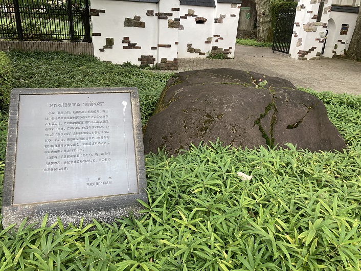 萬助橋と三鷹駅の中間辺りに大正時代を想わせるこじゃれた洋館の山本有三記念館が建っています。作家・山本有三が1936年(昭和11年)から1946年(昭和21年)まで家族とともに住んだ家です。有三はここで代表作「路傍の石」や戯曲「米百俵」を執筆するとともに、自らの蔵書を利用して「ミタカ少国民文庫」を開きました。戦後、進駐軍の接収に遭い有三はやむなく転居しましたが、接収が解除された建物は研究所や文庫として利用された後、1996年(平成8年)に「三鷹市山本有三記念館」として開館しました。現在は山本有三の生涯と作品を紹介する施設として公開し、展覧会や朗読会などの事業も行っています。記念館の門の前に大きな石が置かれていますが、これは昭和12年に山本有三が中野旧陸軍電信隊付近の道端で大きな石を見つけ、この家の裏庭に運び込んだと伝えられています。ここで生まれた作品の名にちなみ「路傍の石」と呼ばれています。。。ということが石の隣りにある碑文に書かれています(私は読みませんでしたが)。