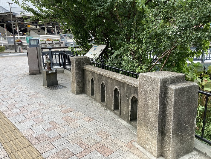 玉川上水 は承応2年(1653年)に当時の江戸市中に飲料水を送るために、43kmにわたって開削 された水路です。明治初期には物資を輸送する為の通船があり、この近くにも船着場があったとも伝えられていますが、衛生上の理由などから2年間で廃止されたといわれています。三鷹橋は昭和32年(1957年)6月に架けられ、構造材の一部に鉄道のレールを活用していましたが、駅前広場の整備に伴い、平成17年(2005年)3月に旧三鷹橋の親柱 、高欄のデザインを活かして架け替えられたものです。ここに旧三鷹橋の一部を保存し架け替えの記念といたします。