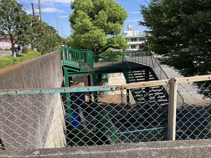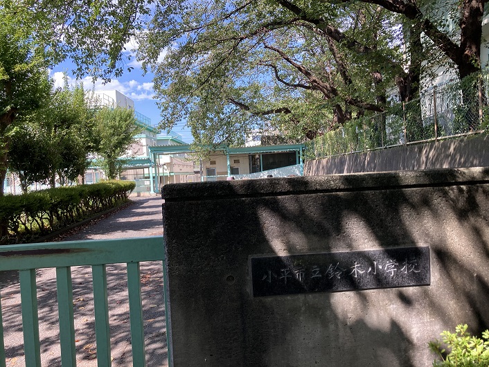 石神井川はよく知られていますので、ネットには沢山の情報で溢れています。源泉については、かっては小平市にある鈴木小学校の敷地内にあったとのことです。現在では政財界の要人がプレーし、メンバープレー料金が日本一高いといわれる小金井カントリー倶楽部の敷地内の湧水とされています。ただ、小金井カントリー倶楽部の敷地内では暗渠化されており、河川として姿を現すのは小金井公園の小平口横の公園北橋です。完璧を目指して元々の源泉である鈴木小学校に向います。鈴木小学校は新小金井街道に面していて、公共交通の便はバスしかありません。武蔵小金井駅北口から西武バスに乗って日立国際電気前に向います(国分寺駅から立川バスで直接鈴木小学校に行くこともできます)。日立国際電気前に降り立ちますと、校外の住宅地には不釣り合いな大きなビルが並んでいます。無線通信機器や放送・映像機器の製造販売を手がける大手企業なのだそうです。新小金井街道までは歩いて10分位です。鈴木小学校までは更に新小金井街道に沿って10分ほど歩きます。周囲は平坦な土地で、住宅や農地が広がっています。おんや、突然崖というか窪地が現れます。下を見下ろしますと、校庭と校舎が見えます。ここが鈴木小学校のようです。体育の授業中でしょうか、何人かの児童が集まって座り込んでいます。改めて周囲を見渡しますと小学校の敷地全体が窪地の中にあるように見えます。校庭に降りる階段は閉ざされていますので、回り込んで正門の方に向います。