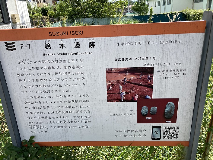 石神井川の水源部の谷頭部を取り巻くように分布する遺跡で、都内有数の規模をもっています。昭和49年(1974年)、鈴木小学校の建設に伴って江戸時代の水車の水路跡などが見つかったことがきっかけで確認されました。この遺跡からは、今からおよそ3万数千年前から1万5千年前の後期旧石器時代の遺物が数多く、また何層にもわたって発見され、わが国の後期旧石器時代を代表する遺跡となりました。中でも刃の部分を磨いて尖らせる局部磨製や打製の斧形石器は、この遺跡を代表する遺物のひとつです。