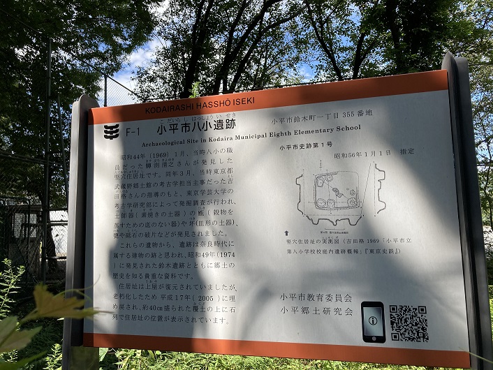 左に進んだ直ぐ先にまた小学校があります。小平第八小学校だそうです。鈴木小学校と大して離れていませんが、小平市には小学生が多いのでしょうか?道路に面した校庭のフェンス際に案内板が立っていました。小平市の小学校は遺跡と縁がありそうです。