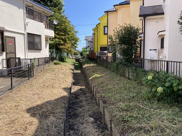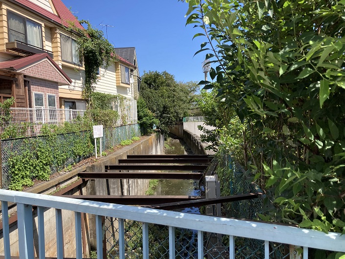 ゴルフ場のフェンスに沿って北に向います。ようやくフェンスが途切れ、住宅地の中を進みますと、何やら掘割のような溝が一直線に延びています。ひょっとして、これが石神井川の流路の跡なのでしょうか?掘割には側道がありませんので、その先を確かめるには更に北に進んで回り道をするしかありません。