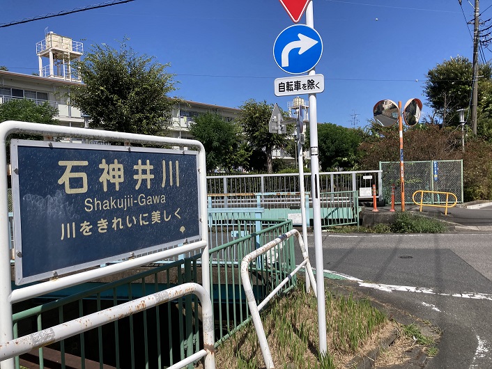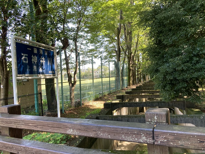案内板の先に石神井川の立て札が見えます。どうやら、石神井川はここで姿を現しているようです。確かに水が流れています。