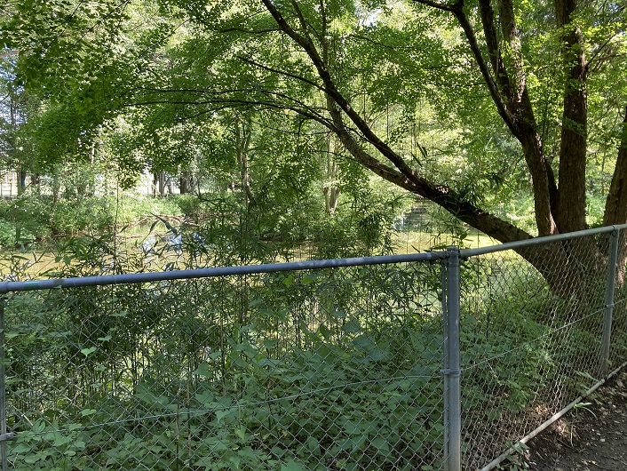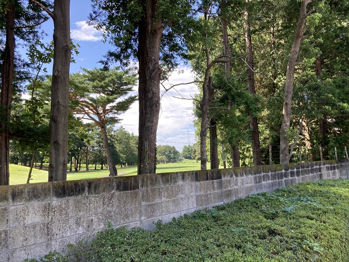 コンクリートの蓋はゴルフ場の壁に沿って続いており、更に辿っていきますとフェンスで行く手を阻まれます。フェンスの先には木々で覆われた川筋と思われる窪地が延びています。現在の石神井川の源泉はゴルフ場の湧水とされており、常に水が流れている訳ではないそうです。ということで今は干上がった状態なのでしょうか?