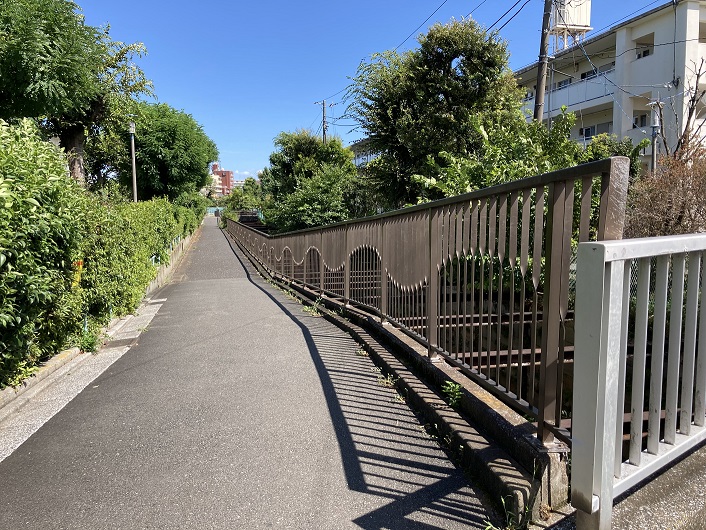鈴木街道と交差した石神井川の流路はそのまま北に向っていて、小高く盛り土された土手の下のトンネルに流れ込んでいます。地図を見ますと、土手は多摩湖自転車道となっています。随分前に歩いた道ですが、まさかこんなところで再会するとは夢にも思いませんでした。この先の石神井川には側道も見当たらないし、多摩湖自転車道を横断するすべもないので、回り道をして先に進むしかありません。