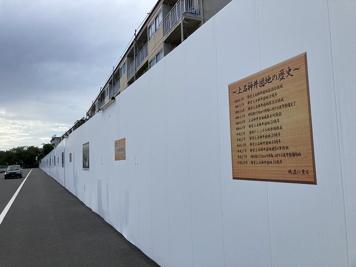 武蔵関公園を出ますと、武蔵関駅は目の前です。既に空は雨雲で覆われ、何時雨が降ってくるか分かりません。今日はここまでにしようかなと弱気の虫がささやきますが、強気の虫がそれを拒絶します。ここから先、西武新宿線から離れていきますので帰宅するには不便です。ま、何とかなるでしょう。川の左手に工事用の塀で囲まれた団地らしき建物群があります。都営上石神井アパートというのだそうです。平成21年から建て替え工事が始まっていて、未だ進行中のようです。子だくさんの時代のお祭りの写真なんかが塀に貼ってあって、往時を偲ばせています。