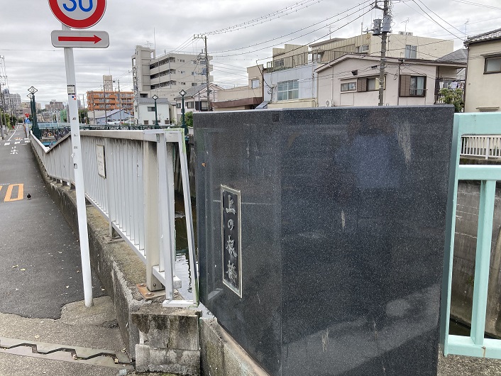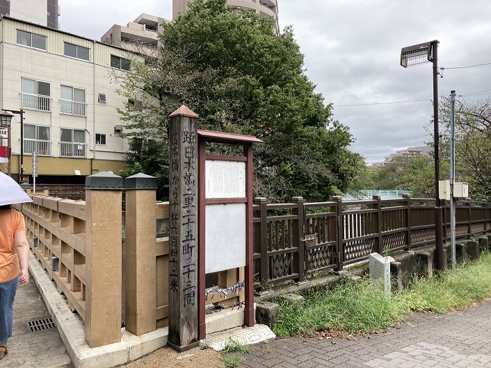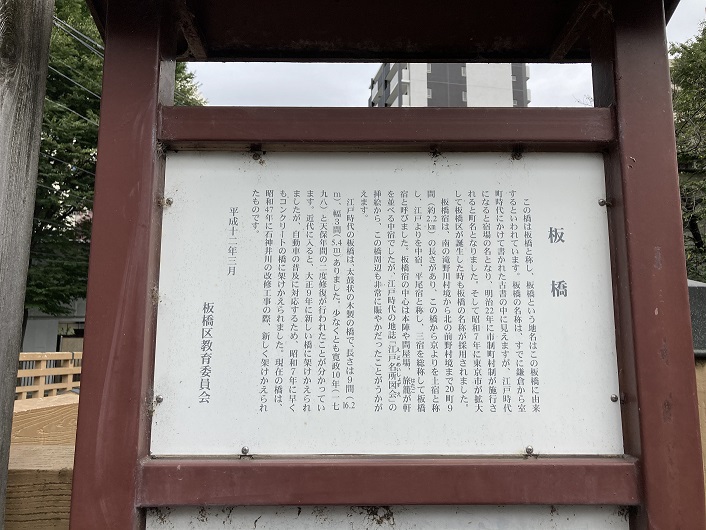 橋の袂に木柱が立っていて、片面に「距日本橋二里二十五町二十三間」、もう片面に「日本橋から十粁六百四十二米(10km642mの距離)」と書かれています。その横には案内板が立っていて、板橋の歴史が記されています。橋の欄干が木製なのも架けられた当時を再現しているのでしょう。