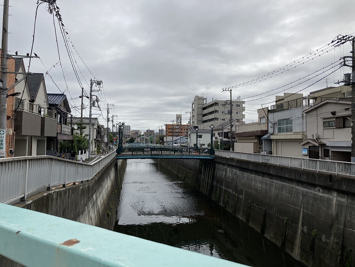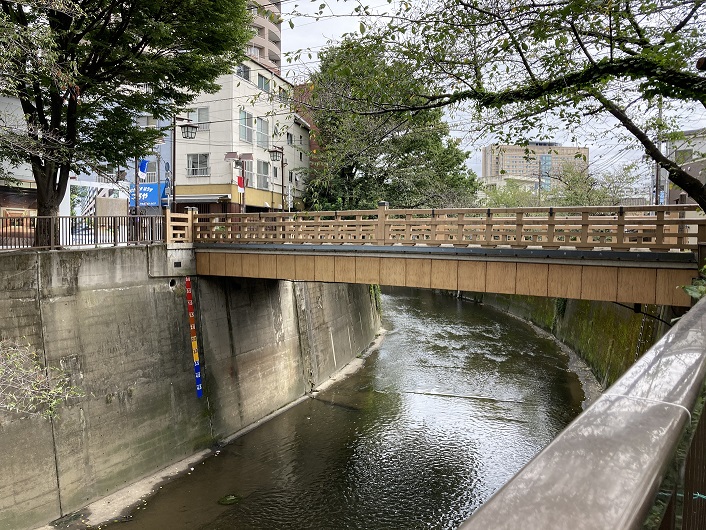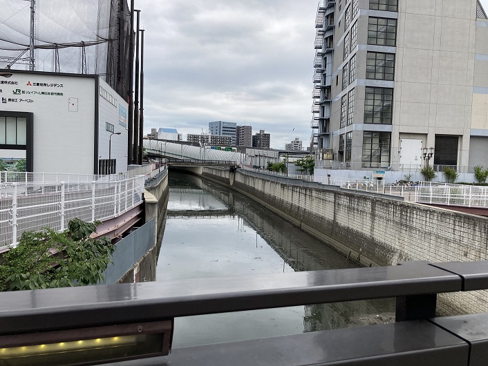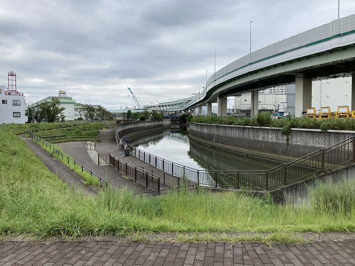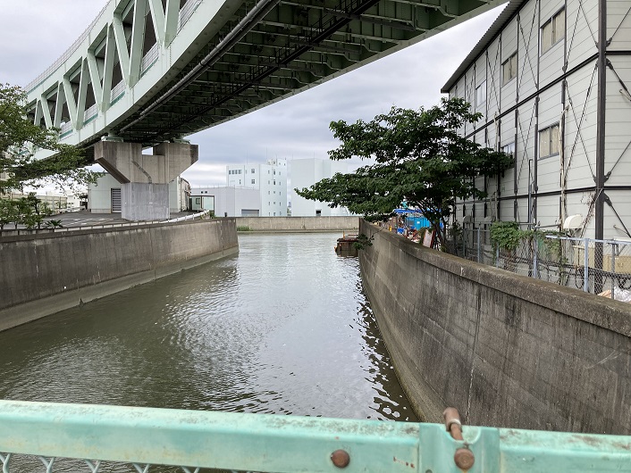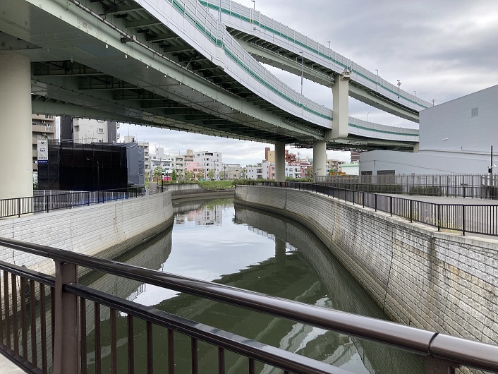 テラスの先で遊歩道は行き止まりとなり、やむなく近くの路地を迂回します。道に迷いながらも路地を巡って新堀橋に辿り着きました。石神井川に架かる最後の橋です。首都高中央環状線の高架下がちょうど石神井川と隅田川の合流地点となります。この辺りの水は割と綺麗です。きっと隅田川の水で石神井川の水の汚れが薄められたのでしょう。