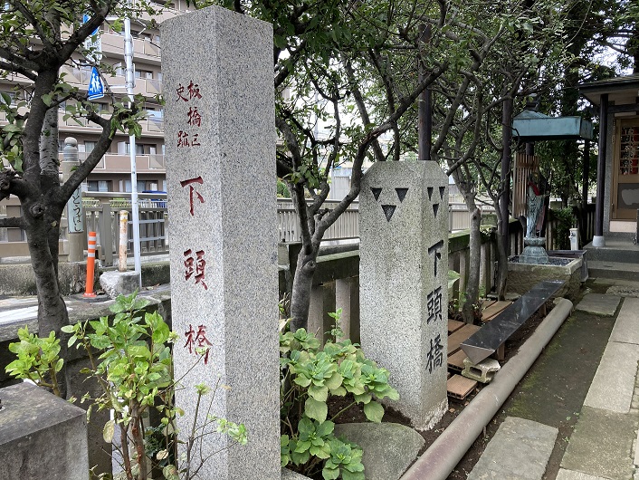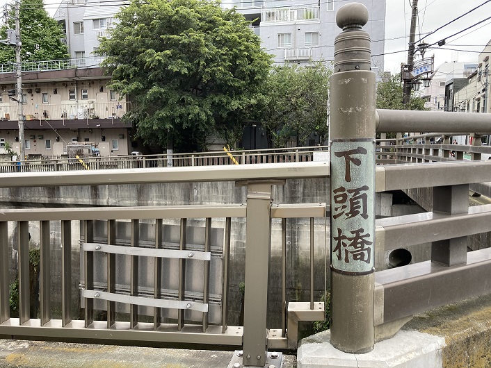 これといって特記するような見所もなく、淡々と歩いて行きます。とある橋に差し掛かると、下頭橋という橋名になっています。10年ほど前に武蔵野の路の石神井川コースを歩いていたときに通りかかったのですが、その名のいわれは橋の袂に鎮座する神社の境内の案内板に記されています。