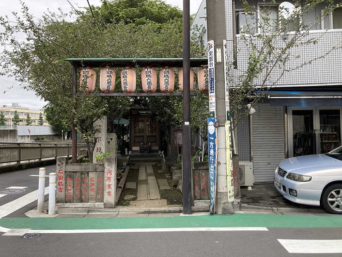 弥生町を縦断する道が旧川越街道で、大山町境から石神井川迄が上板橋宿跡である。宿端の石神井川に架かる下頭橋は、寛政十年(一七九八年)近隣の村々の協力を得ることで石橋に架け替えられ、それまで頻発していた水難事故も後を絶ったという。この境内にある「他力善根供養」の石碑はその時に建てられたもの。橋の名の由来については諸説がある。一つ目は、旅僧が地面に突き刺した榎の杖がやがて芽を吹いて大木に成長したという逆榎がこの地にあったから。二つ目は、川越城主が江戸に出府の際、江戸屋敷の家臣がここまで来て頭を下げて出迎えたから。三つ目は、橋のたもとで旅人から喜捨を受けていた六蔵の金をもとに石橋が架け替えられたからというもので、六蔵祠はこの六蔵の道徳を湛えて建てられた。同橋と六蔵祠は昭和六一年度の板橋区登録記念物(史跡)に認定された。