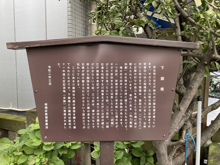 弥生町には江戸時代の川越往還が通っています。そのうち、大山町の境から当地までの街道沿いは上板橋宿となっていました。石神井川に架かる下頭橋は、寛政十年(一七九八年)に近隣の村々の協力を得ることで石橋に架け替えられています。境内にある「他力善根供養」の石碑はその時に建てられたものです。橋の名の由来については諸説があります。一つ目は、旅僧が地面に突き刺した榎の杖がやがて芽を吹いて大木に成長したという「逆榎」がこの地にあったという説。二つ目は、川越往還を利用する川越藩主が江戸に出府の際に、江戸屋敷の家臣がここまで来て出迎え頭を下げたからという説。三つ目は、橋のたもとで旅人から喜捨を受けていた六蔵の金をもとに石橋が架け替えられたからという説の三つが伝わっています。ここにある六蔵祠は六蔵の遺徳を湛えて建てられたものです。下頭橋と六蔵祠は昭和六一年度に区記念物(史跡)に登録されました。