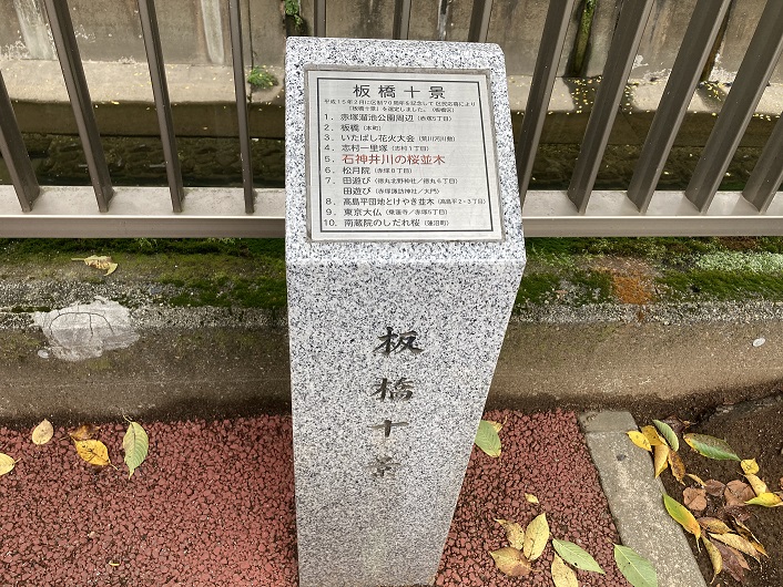 遊歩道の脇に板橋十景と書かれた石柱が立っていました。世田谷百景というのもありましたが、それに似たようなものですね。この辺りは5番目の石神井川の桜並木ということですが、石神井川にはあちこちに桜が植えられていますので、どこが一番かということは人によって意見が異なるところでしょう。今の季節は残念ながら桜の木の落ち葉を感傷的に眺めるだけですね。
