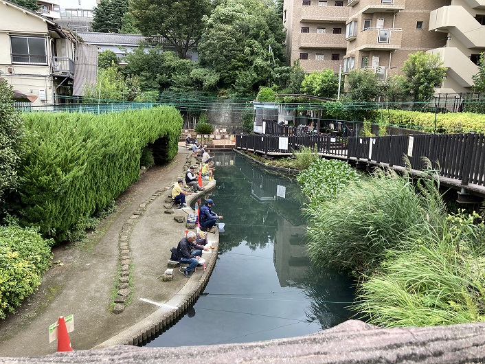 石神井川は昔はかなり蛇行していて、大雨になった際にはあちこちで氾濫していたそうです。その後、水害を防ぐために流路の改修が行なわれ、蛇行区間を直線に造り替える工事が行なわれてきました。中山道(その上に首都高5号線が通っている)の手前に、流路の直線化によって切り離された旧河川が釣り堀になっています。川の水の代わりに人工の滝が設けられ、その水が釣り堀に供給されています。釣り堀の先は石神井川に繋がっていますので、常に水が入れ替わっているのです。太公望には天国のような施設です。