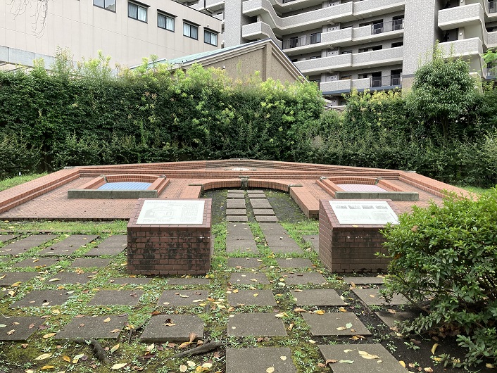 地名は加賀に変わります。名前からも想像できるように、江戸時代にはこの地に加賀藩の下屋敷がありました。明治時代になってからは、下屋敷の跡地に陸軍の火薬製造所が造られ、それをモニュメントとしたコミュニケーションステージが遊歩道の奥に設けられています。
