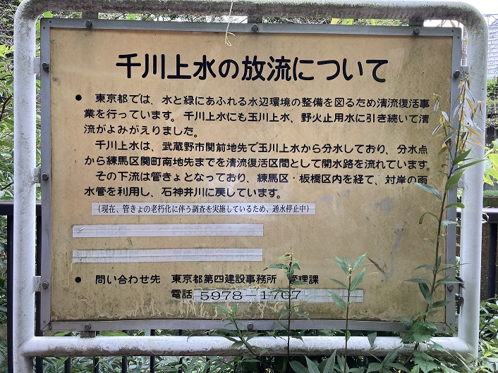 石神井川に架かる埼京線の線路下をくぐったところにかなり大きな排水口があります。案内板によりますと、現在は休止されていますが、千川上水から石神井川に繋がる暗渠の放流口だそうです。玉川上水から千川上水、そして石神井川と多摩川の水は巡り巡ってこんなところまで流れていたんですね。