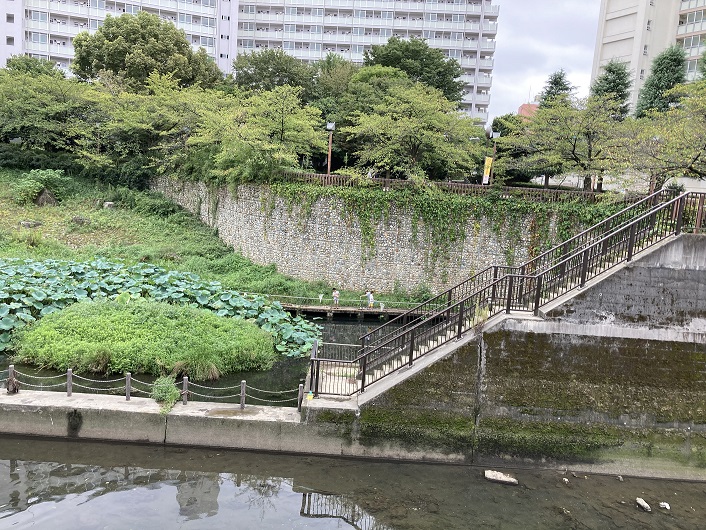 石神井川の歩きは北区に入ります。川の周辺にもいろんな施設が造られています。都心には珍しい蓮田も見かけます。蓮の実は日常的にはあまり食用にされませんが、実は大変美味しいのです。蓮は花が枯れた後に実をつけます。秋になると花が枯れて、茎が分厚くなった花托(かたく)が大きくなり、その中に実をつけます。花托はだんだんと肥大化し、表面にたくさんの通気口となる穴が空いてきます。この穴の中で、どんぐりのような緑色の実が育ちます。これが蓮の実です。蓮の実は、でんぷん質が豊富で、トウモロコシのような食感があります。また、ビタミンB1、カルシウム、カリウム、食物繊維も含まれています。私が子供の頃、晩夏のお祭りなどでよく屋台で見かけました。花托ひとつがお小遣いで買える位の安さで、お八つ代わりに食べたものです。東京では滅多に見かけませんが。