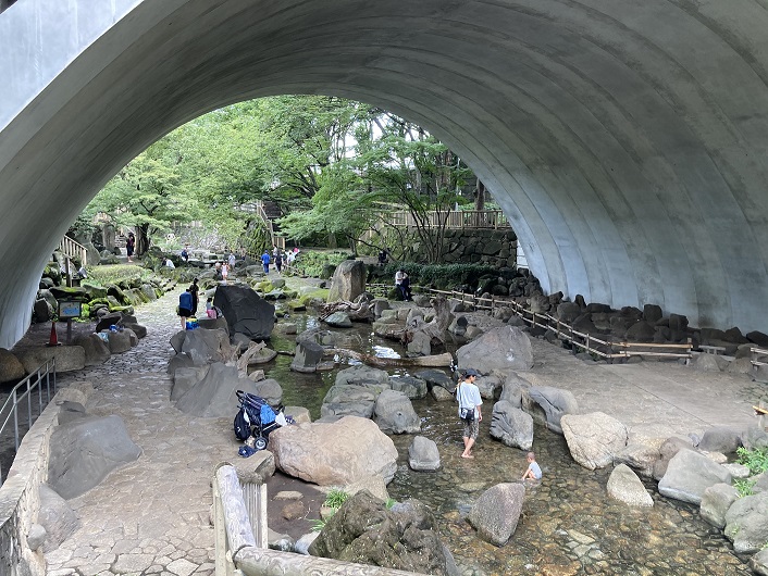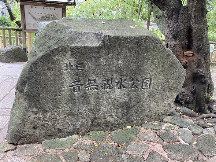 石神井川は王子駅の手前で音無親水公園の中を流れます。でも、本流はその手前で分流し、飛鳥山公園の下を流れて王子駅の先で再合流しています。石神井川は北区付近ではかって「音無川」と呼ばれ親しまれ、古くからの春の桜・夏の青楓と滝あび・秋の紅葉など四季の行楽の名所・景勝の地でした。しかし、戦後の経済の復興・発展とともに石神井川も生活排水などで汚れた川となり、洪水による被害を防ぐ目的で、昭和30年代から始まった改修工事によって緑の岸辺は厚いコンクリートの下へと消え、典型的な都市河川となりました。この改修工事で、飛鳥山公園の下に2本のトンネルを掘り、石神井川流路のショートカットが行われ、残された旧流路に「かつての渓流を取り戻したい」として音無親水公園ができました。夏の盛りは過ぎましたが、今日も水遊びの家族連れで賑わっています。