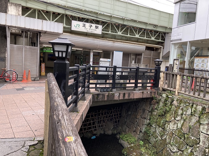 音無親水公園から流れ出た水は王子駅の手前で駅舎の下に潜ります。その先はどうなっているのかというと、明治通りを渡った先の都電王子駅横に堀があって、そこに流れ出ているのです。今まで何回も王子駅には来ていましたが、こんな堀が石神井川のなれの果てだとは夢にも思いませんでした。水も殆ど流れていないし、単なる窪地と思えるのも当然です。というか、その窪地ですら全く印象に残っていません。