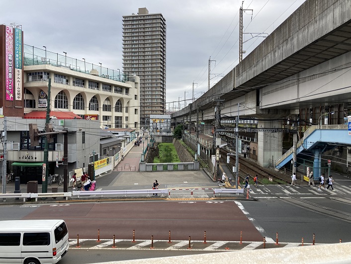 溝田橋で明治通りを渡ります。石神井川の両岸はフェンスで囲われていますが、その中に細い通り道がありました。その先にはテラスが設けられていて釣りをしている人も見かけます。こんな汚れた川で魚を釣ってどうするのでしょうかね?
