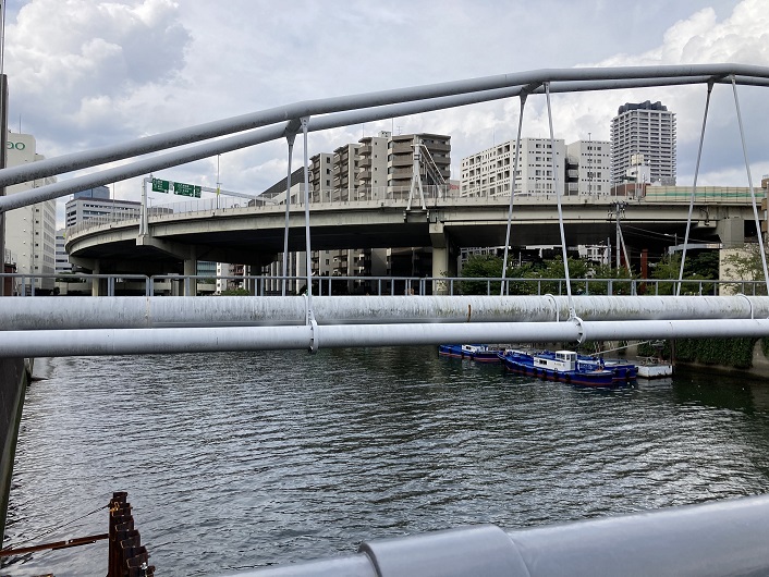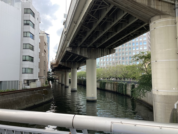 三崎橋からずっと日本橋川の上に架かっていた首都高速道路は茅場町駅の先の霊岸橋附近でほぼ直角に向きを変え、北東方向に延びて行きます。一方、日本橋川はそのまま直進しますので、ここから先の隅田川との合流地点まで初めて橋脚のない本来の水面を見ることができます。