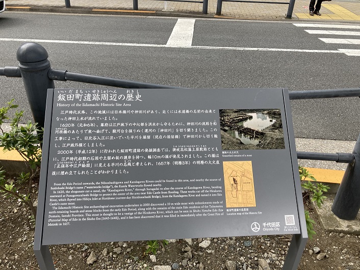 江戸時代以降、この地域には日本橋川や神田川があり、近くには水道橋の名前の由来となった神田上水が流れていました。1620年(元和6年)、幕府は江戸城下の中心部を洪水から守るために、神田川の流路を船河原橋のあたりで東へ曲げて、駿河台を掘りぬく運河の「神田川」を切り開きました。この工事によって、日比谷入江に注いでいた平川を掘留(現在の掘留橋)で神田川から切り離し、江戸城外堀としました。2000年(平成12年)に行なわれた飯田町遺跡の発掘調査では、讃岐高松藩上屋敷跡とともに、江戸時代初期の石垣や土留め坂の護岸を持つ、幅10mの堀が発見されました。この堀は「正保年中江戸絵図」に見える平川の名残と考えられ、1657年(明暦3年)の明暦の大火直後に埋め立てられたことがわかりました。