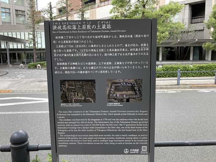 飯田橋二丁目から三丁目に広がる飯田町遺跡からは、讃岐高松藩(現在の香川県)の上屋敷跡が発掘されました。上屋敷は1706年(宝永3年)に幕府から与えられたもので、藩主が住み、政務を執り行なった屋敷です。12万石の領地を支配した高松藩松平家は、初代藩主松平頼重が水戸藩2代藩主徳川光圀の兄にあたり、徳川御三家である水戸藩ゆかりの大名でした。発掘調査では御殿をはじめ、庭園跡、上下水道跡、土蔵跡などが見つかっています。土蔵跡の基礎には、大きな礎石の下に木の土台が用いられていました。その礎石は、現在川沿いの遊歩道のベンチに再利用しています。