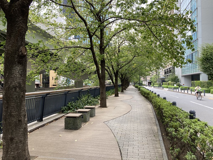 日本橋川が明大通りを越える錦橋の先から大手町川端緑道が始まります。私は緑道の存在を今まで全く知らなかったのですが、2014年4月22日に開通したのだそうです。随分前から存在していたのですね。大手町川端緑道は、UR都市機構が進める大手町土地区画整理事業(施行面積:約17.4ヘクタール)の一貫として日本橋川沿いに整備された延長約780mの歩行者専用道です。親水空間を取り巻く4つの「環境」(自然・都市・歴史・生活)をキーワードとして快適な歩行空間の創出が図られました。「自然環境」の面では、皇居から隅田川を経由して東京湾へ至る水と緑のネットワークの一部となる緑量を確保し、また皇居やその周辺に生息する生き物の中から出現頻度の高いチョウ類や鳥類を誘致指標種に設定し、食餌植物を織り交ぜた植栽計画で歩専道内への誘致を試みています。「都市環境」の面では、保水性舗装の導入や浸透桝の設置、ポールスポット灯による木漏れ日のような夜間照明などにより、光や陰や温度や湿度などが快適にコントロールされる空間づくりが行なわれています。「歴史環境」の面では、江戸小紋をモチーフにした石張舗装、江戸後期の地図と現在の地図を重ねて表示した案内サインなどにより、まちの地歴を景観要素として活用しています。「生活環境」の面では、周辺のオフィス街の人々に安らぎを提供する場として、四季の季節変化が楽しめる植栽や昼食時にキッチンカーが進入できる空間の整備などが行われています。そして、これら4つの「環境」と歩専道内で想定される様々なアクティビティをちりばめた街の風景を一幅の絵巻物「日本橋川環境絵巻」として紡ぎ出すことを目指しています。さらに、その絵巻物を緩やかに蛇行する敷地形状と立地特性をきっかけにして丁寧に「折り込む」ことで、総延長が長い歩専道空間のアクセントとして賑わい拠点となる十箇所の見所をしつらえています。