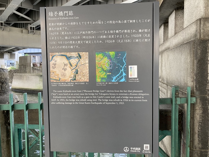 家康が朝鮮からの使節をもてなすための雉をこの附近の鳥小屋で飼育したことが橋名の由来です。1629年(寛永6年)に江戸城外郭門のひとつである雉子橋門が築造され、橋が架けられました。橋は1903年(明治36年)に鉄橋に改架されました。1923年(大正12年)9月1日の関東大震災で被災したため、1926年(大正15年)に新たに架けられたのが現在の橋です。