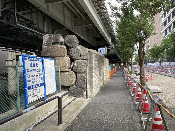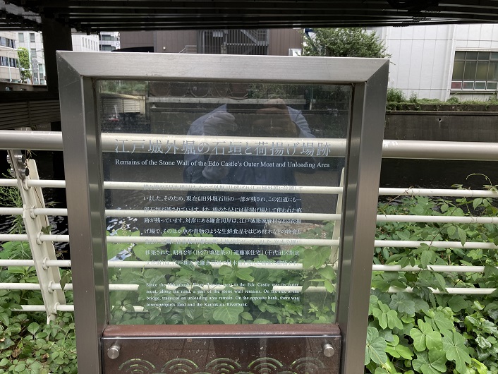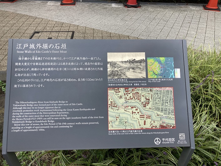 雉子橋から常磐橋までの日本橋川は、かって江戸城外堀の一画でした。関東大震災や首都高速道路建設による護岸改修によって、現在その面影はありませんが、錦橋から神田橋の右岸(南)には昭和期に改修された外堀石垣が点在して残っています。この石列の下には、江戸時代の石垣が高さ約6m、長さ約100mにわたり地下に保存されています。