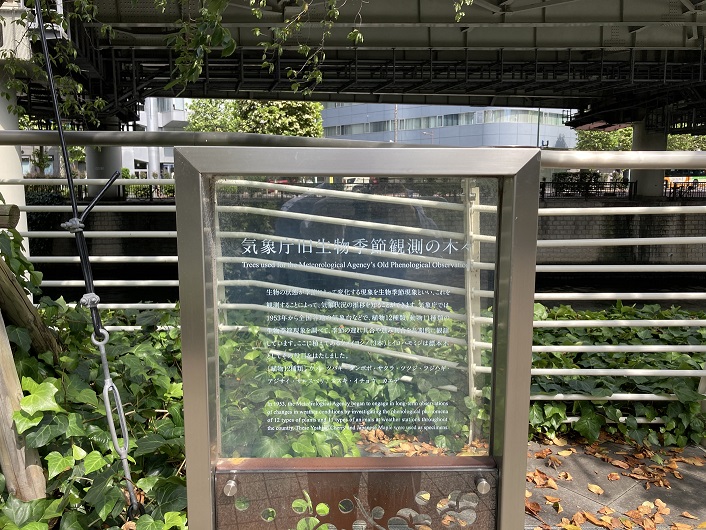緑道の入口には気象庁の庁舎があります。気象庁は、生物季節現象(気温や日照など季節の変化に反応して生物が示す現象)を目や耳で確かめて、その現象が確認できた日を記録する生物季節観測を行なっています。「自然環境」のコーナーに案内板が立っていました。