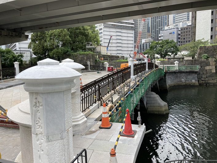 日本橋川には、「ときわばし」と名の付く橋が3つもあるのですが、まん中に架かるのが「常磐橋(旧常盤橋)」です。一番昔から橋が架かっていた場所で、江戸時代にはこの場所には江戸城外郭の枡形門・「常盤橋門」があって、ここに木橋が架かっていました。明治の世になり、江戸城の他の外郭の門は取り壊されていきましたが、その壊された他の門の石垣の石材が利用され、この橋は明治10年に木橋から石橋に架け替えられました。西洋の文化が橋に表現された最初の橋とされています。その後の大正時代、この橋の両隣には関東大震災の前に新常盤橋、震災後に常盤橋が道路橋として架かりました。この時、昔からあった真ん中の橋は、橋を区別する上で「磐」の文字が正式に使われるようになったという説がありますが、異説も多くあります。その後、常磐橋は今日まで常盤橋門の城門の石垣とともに保存され、都内に残る石橋としては最も古い橋となっています。しかし、2011年の東日本大震災の地震が橋の石積みに影響してしまったことがわかり、復旧のための工事が始まって今に至っています。復旧工事のやり方は、個々の石に元ある場所の印をつけて一度解体し、橋台などの基礎の部分から構築し直したあとに石を元の場所に戻す、という途方もない作業です。路面に石を敷く作業では、寸法を合わせるために電気ヤスリやトンカチで石を整形する作業が行われました。石積みの橋なので、ひとつの石にズレがあると全体に影響してしまう可能性があり、精密さが要求される作業でした。今は橋の上部の親柱や欄干の設置作業が行われていて、それらの多くはできるだけ補修してそのまま使い続けますが、痛みの激しい部位は新しい材料に取り替えられます。日本の石橋のほとんどは九州に分布しているので、東日本で見ることのできる石積みの橋としてはこの橋はとても貴重です。そしてさらに、その復旧の作業というのはなかなか見ることができません。