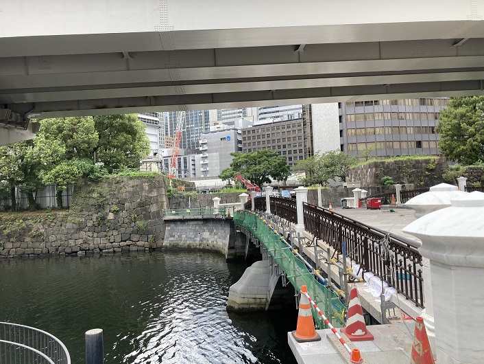 JRの高架を越えた先で、真新しい橋の工事が行なわれていました。親柱に彫られた橋名は古い字体で読めません。帰ってから調べてみましたら、常磐橋の復旧工事なんだそうです。