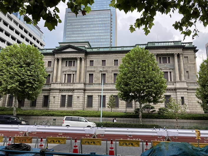 常盤橋の向かいには日本銀行の古めかしい旧館(本館)が建っています。設計者は建築学界の第一人者であった辰野金吾博士です。辰野博士は、日本銀行の支店や東京駅・旧両国国技館などの設計も手がけました。日本銀行は開業当初は日本橋川が隅田川に注ぐ永代橋の袂にありました。昭和57年(1982年)11月に創業百周年を記念して開業地に記念碑を設立しましたが、日本橋川を歩き終える直前に偶然にも歩道の隅っこに置かれているのを見つけました。